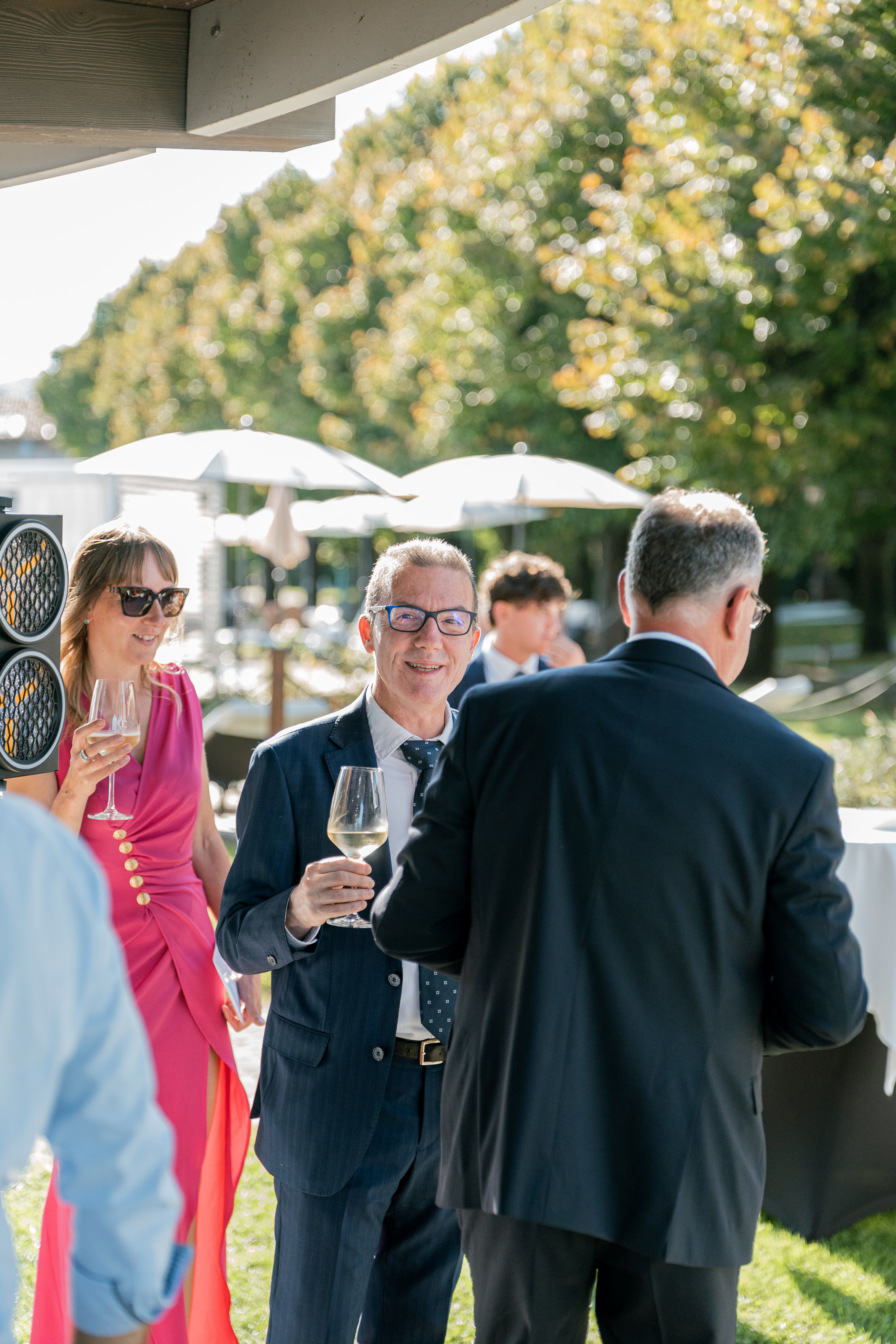 L’aperitivo e lo sguardo sui dettagli Dopo la cerimonia, l’aperitivo ha lasciato spazio agli abbracci, ai sorrisi, ai racconti condivisi. Finger food curati, invitati rilassati, un’atmosfera luminosa e serena. In quei momenti ho lasciato spazio agli sposi e alle persone, concentrandomi sui dettagli: le tavolate, l’allestimento, l’equilibrio della location. Ho scelto di utilizzare anche il drone, come regalo per Luca e Cristiane, per raccontare dall’alto il luogo che aveva accolto la loro storia: Desenzano e il Lago di Garda, visti da una prospettiva diversa.