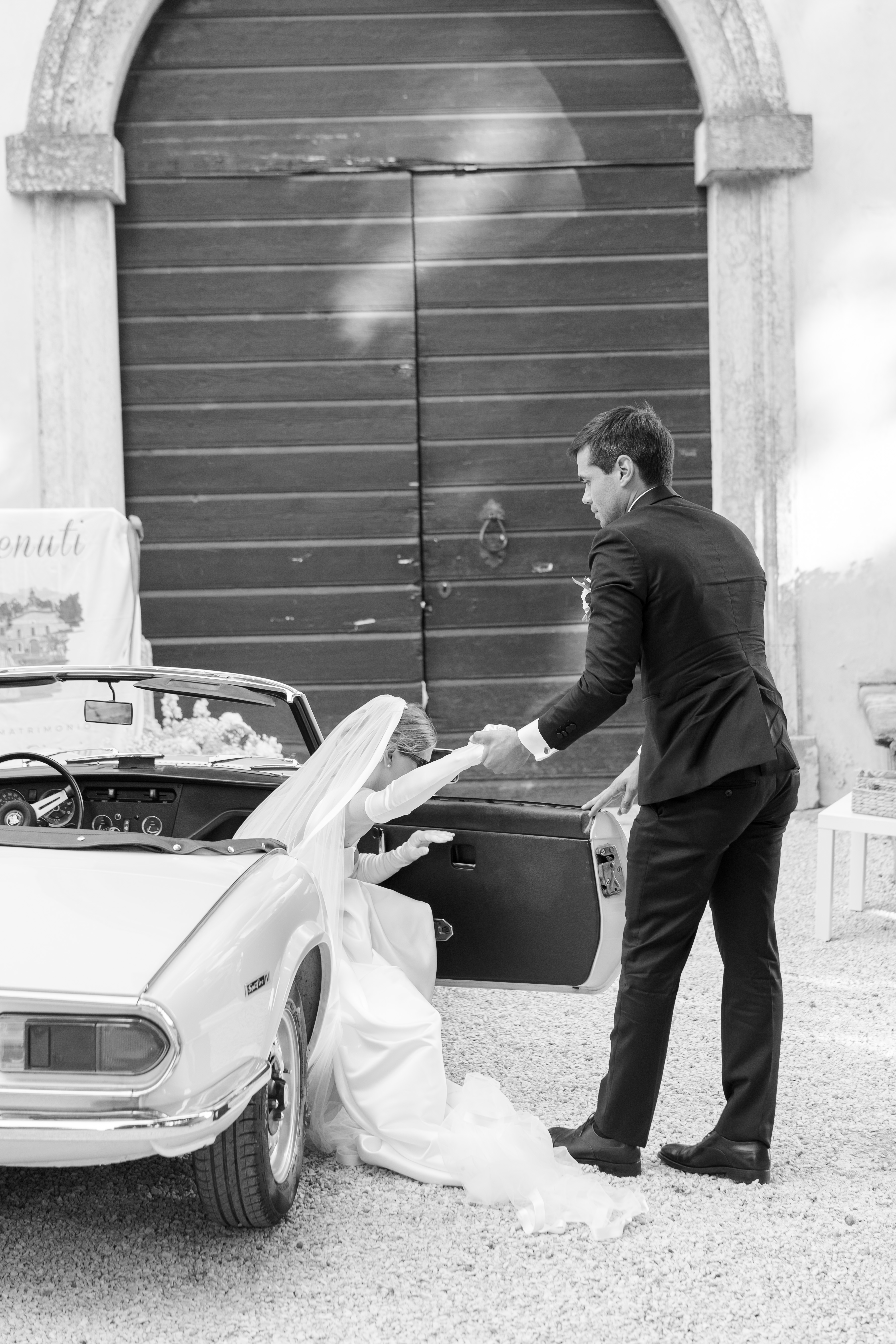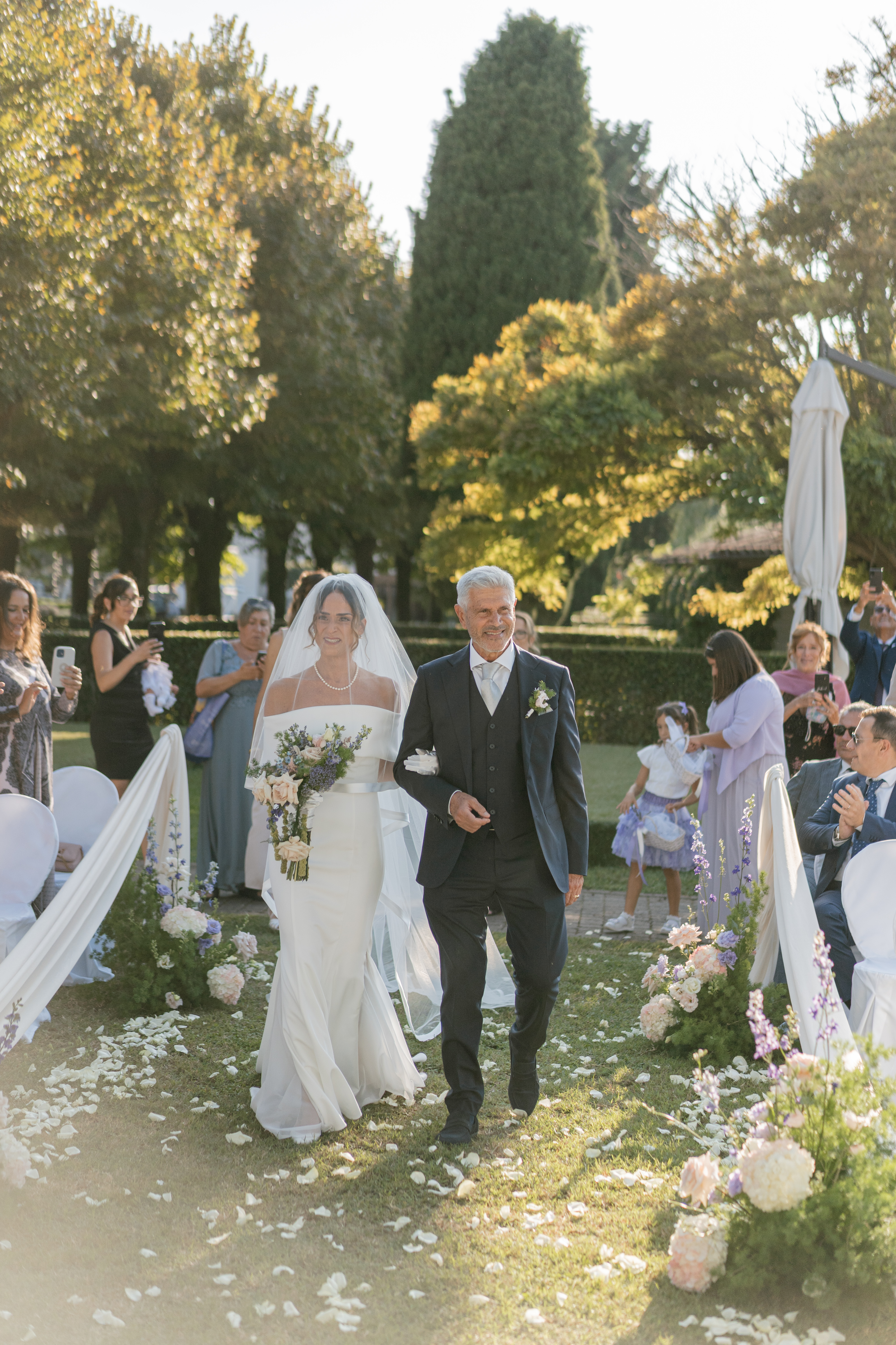 I dettagli prima della cerimonia. Mentre gli invitati prendevano posto e osservavano la bellezza della chiesa, mi sono spostato all’interno per fotografare i dettagli: i fiori, l’altare, le partecipazioni, l’atmosfera che lentamente si costruiva. Per un piccolo incidente stradale, la sposa e il videomaker sono arrivati con qualche minuto di ritardo. Lo sposo è arrivato quasi nello stesso momento. Abbiamo atteso, poi ci siamo posizionati lungo la navata. Quando la sposa è arrivata, accompagnata dal papà, lo ha fatto a bordo di una macchina vintage color beige latte. Un ingresso elegante, coerente con il suo abito: lungo, bianco, romantico. Mi è piaciuto subito.