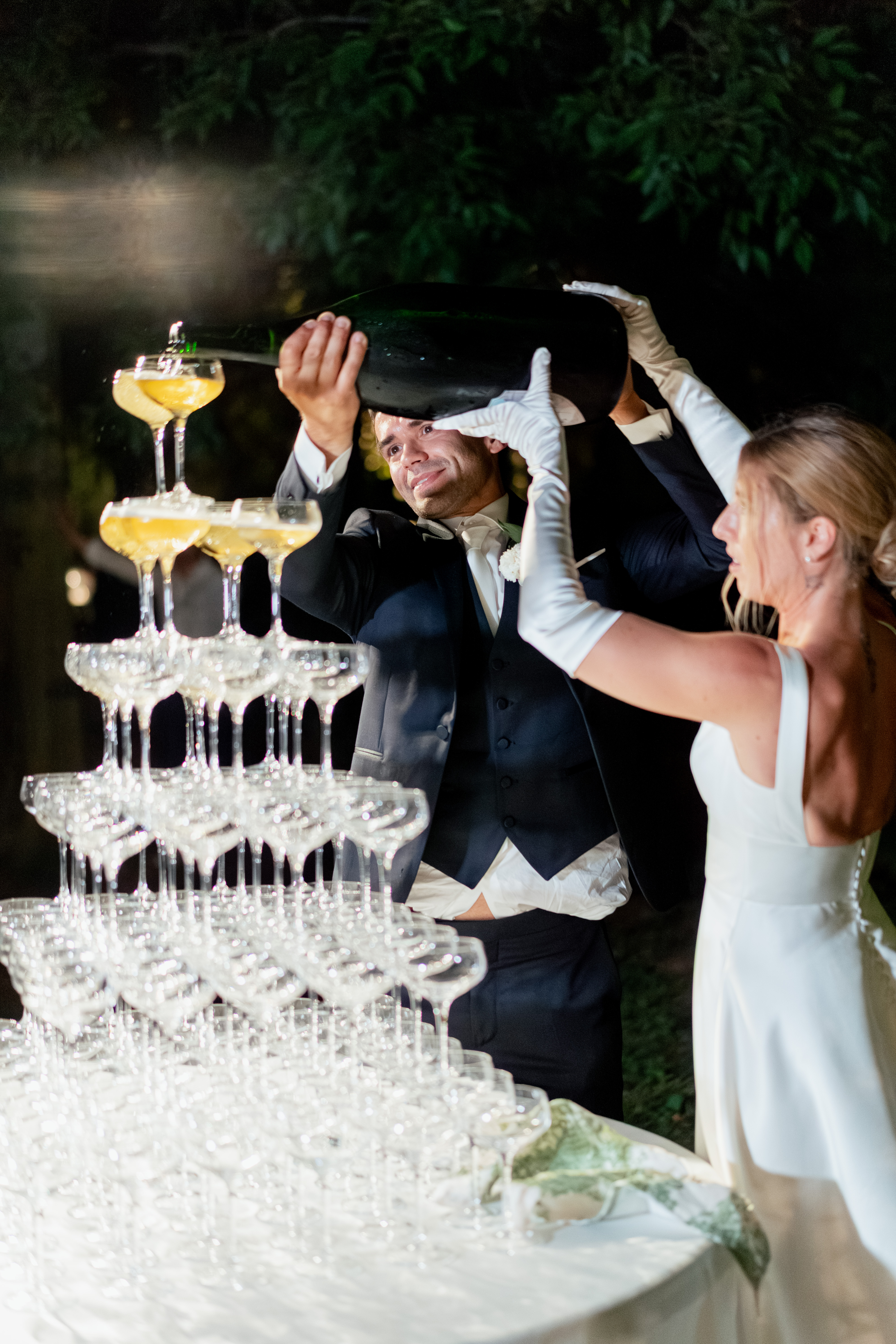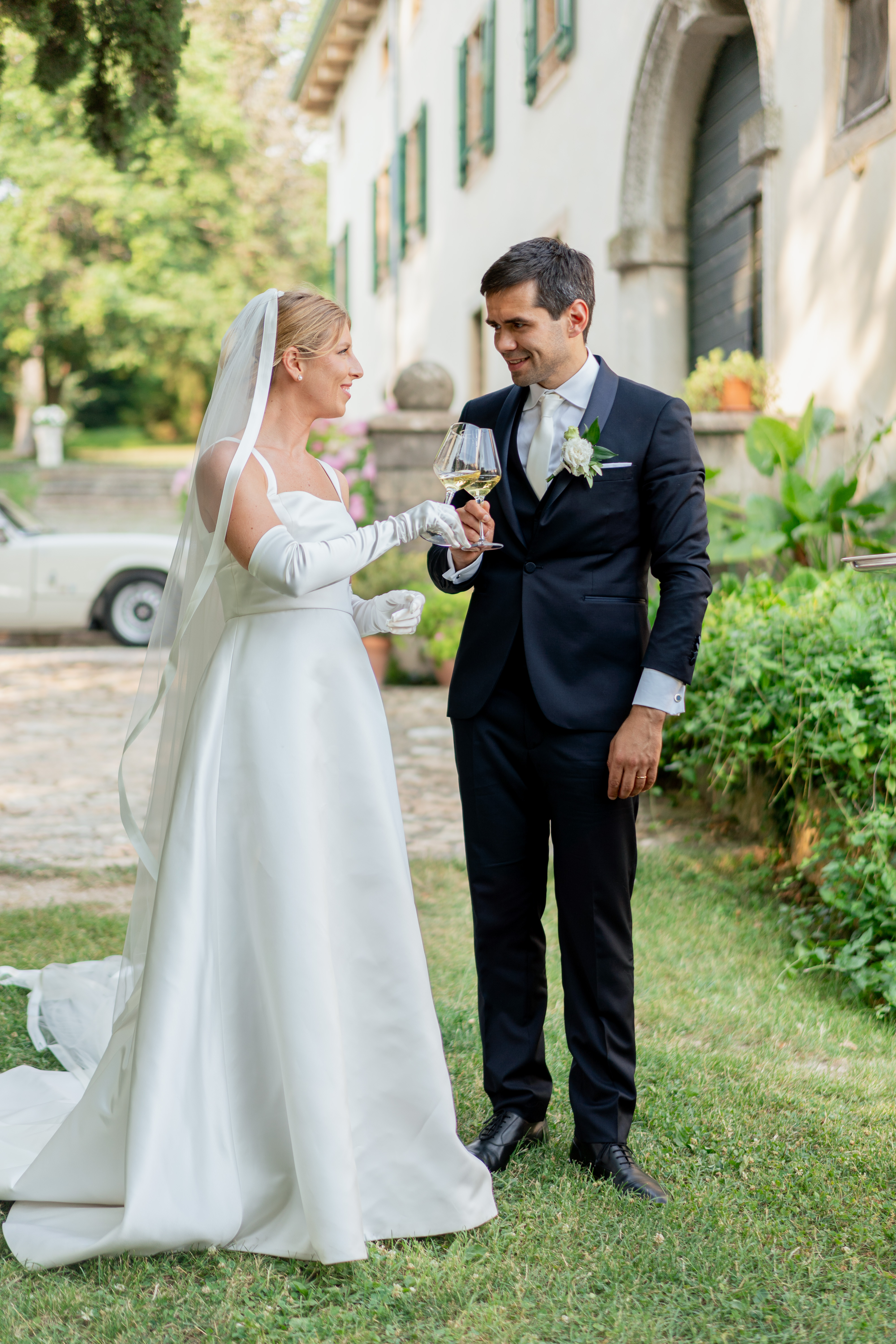 Ritratti spontanei, tra complicità e leggerezza. Dopo l’aperitivo ci siamo dedicati alla coppia. Erano sciolti, rilassati, pieni di voglia di stare insieme. Si baciavano, ridevano, si cercavano continuamente. La sposa non vedeva l’ora di divertirsi e lasciarsi andare, e insieme ci siamo davvero sbizzarriti. Ho valorizzato il suo abito, che mi piaceva moltissimo, ma anche Giorgio, con la sua naturalezza. E naturalmente il loro labrador, parte integrante della giornata e della loro famiglia. Tutto è stato spontaneo, senza forzature. Esattamente come dovrebbe essere.