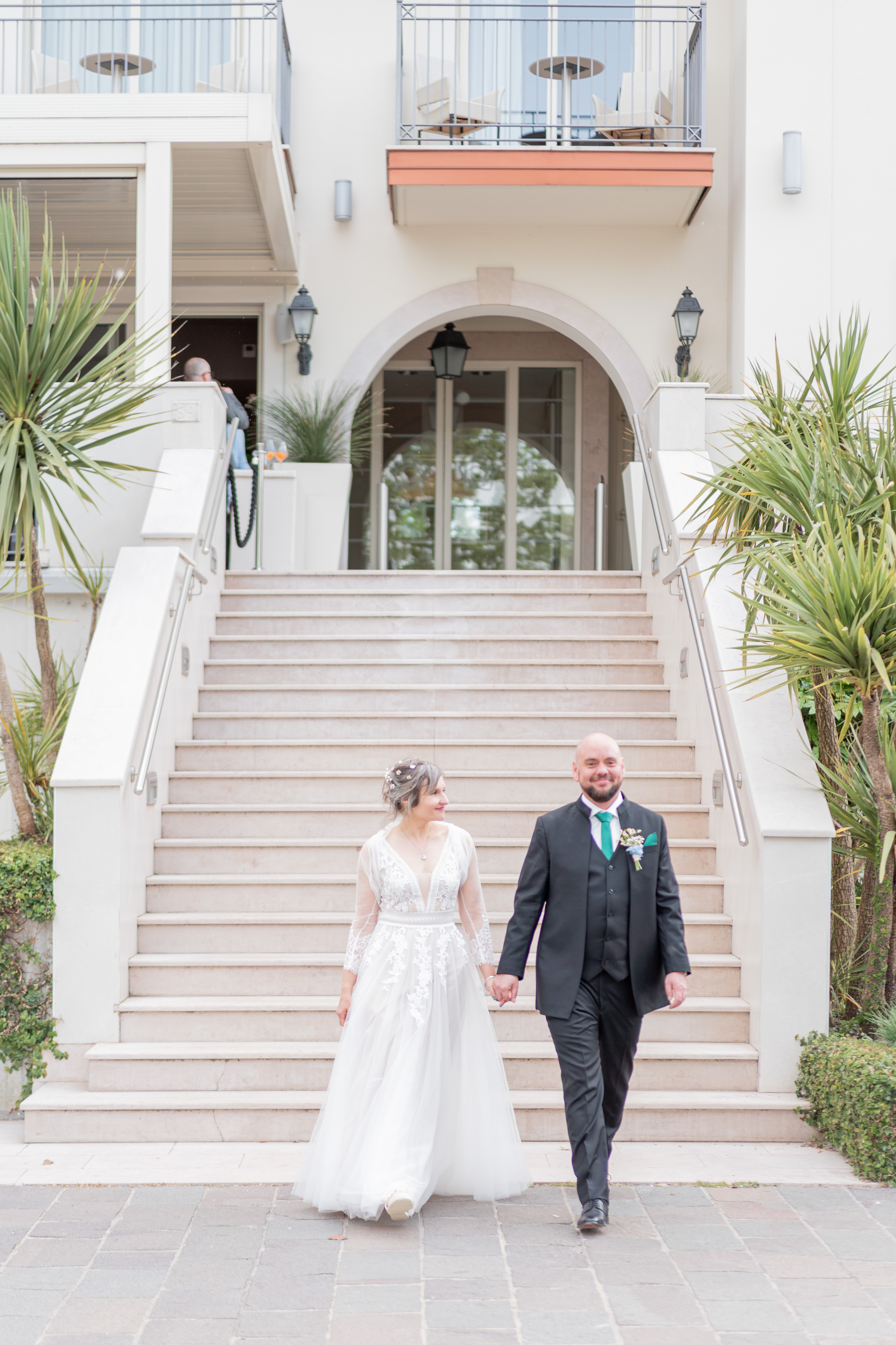 L’attesa: due strade che portano allo stesso momento Dopo la cerimonia civile, Bianca ed io ci siamo allontanati. Marci, insieme agli invitati, ha raggiunto lo Splendido Bay, ignaro di ciò che sarebbe accaduto di lì a poco. Bianca ha indossato il secondo abito: lungo, avvolgente, essenziale. Un vestito che raccontava la sua forma, la sua eleganza, la sua essenza più profonda.