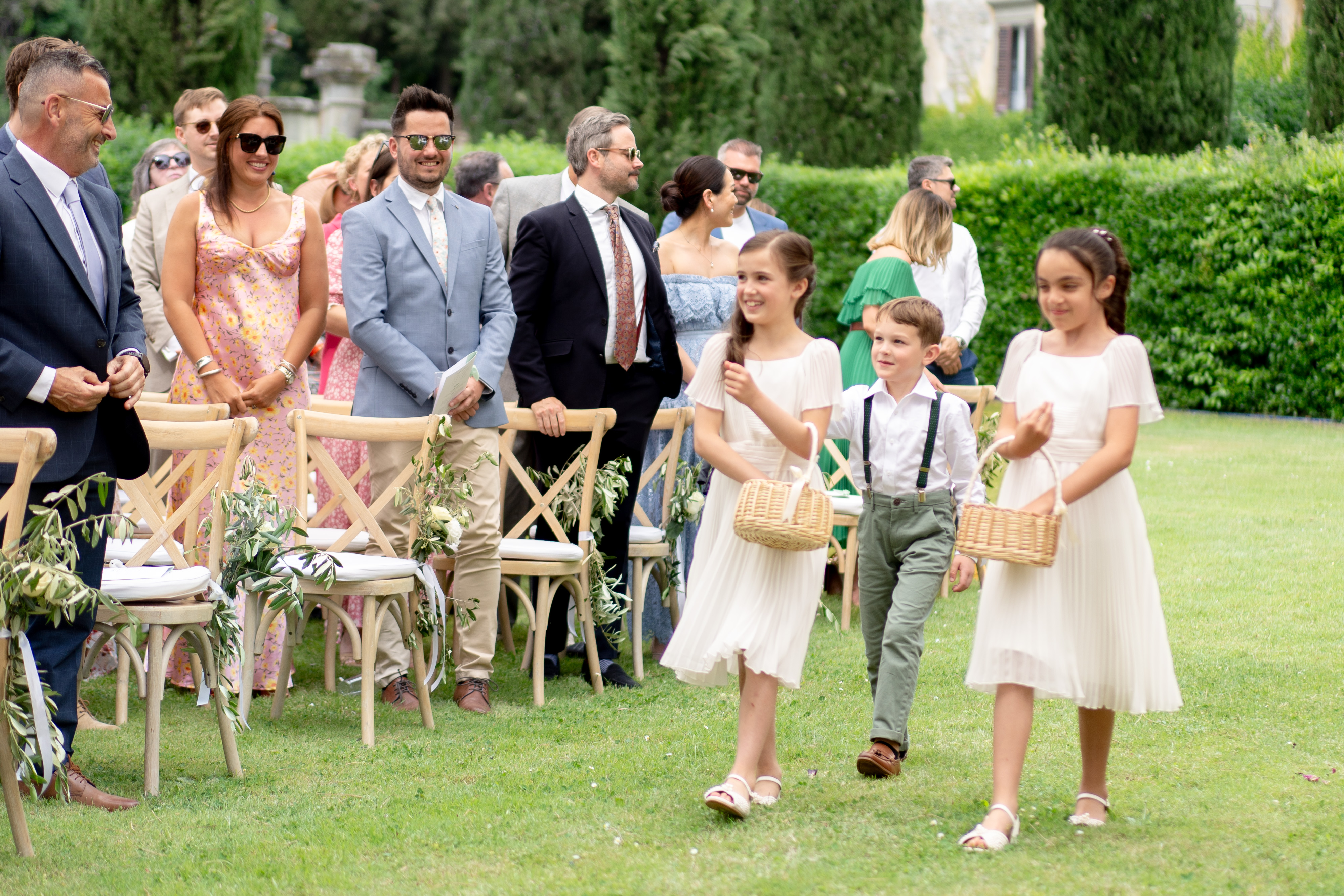 La cerimonia si è aperta con gli invitati seduti, in attesa. Ad aprire il corteo sono stati George e le bambine, con un dress code inglese impeccabile, spargendo fiori con una naturalezza disarmante. Poi le damigelle. E infine Claire, accompagnata dalle gemelle. Un momento potente, composto, emozionante. Di quelli che non hanno bisogno di essere diretti: accadono e basta.