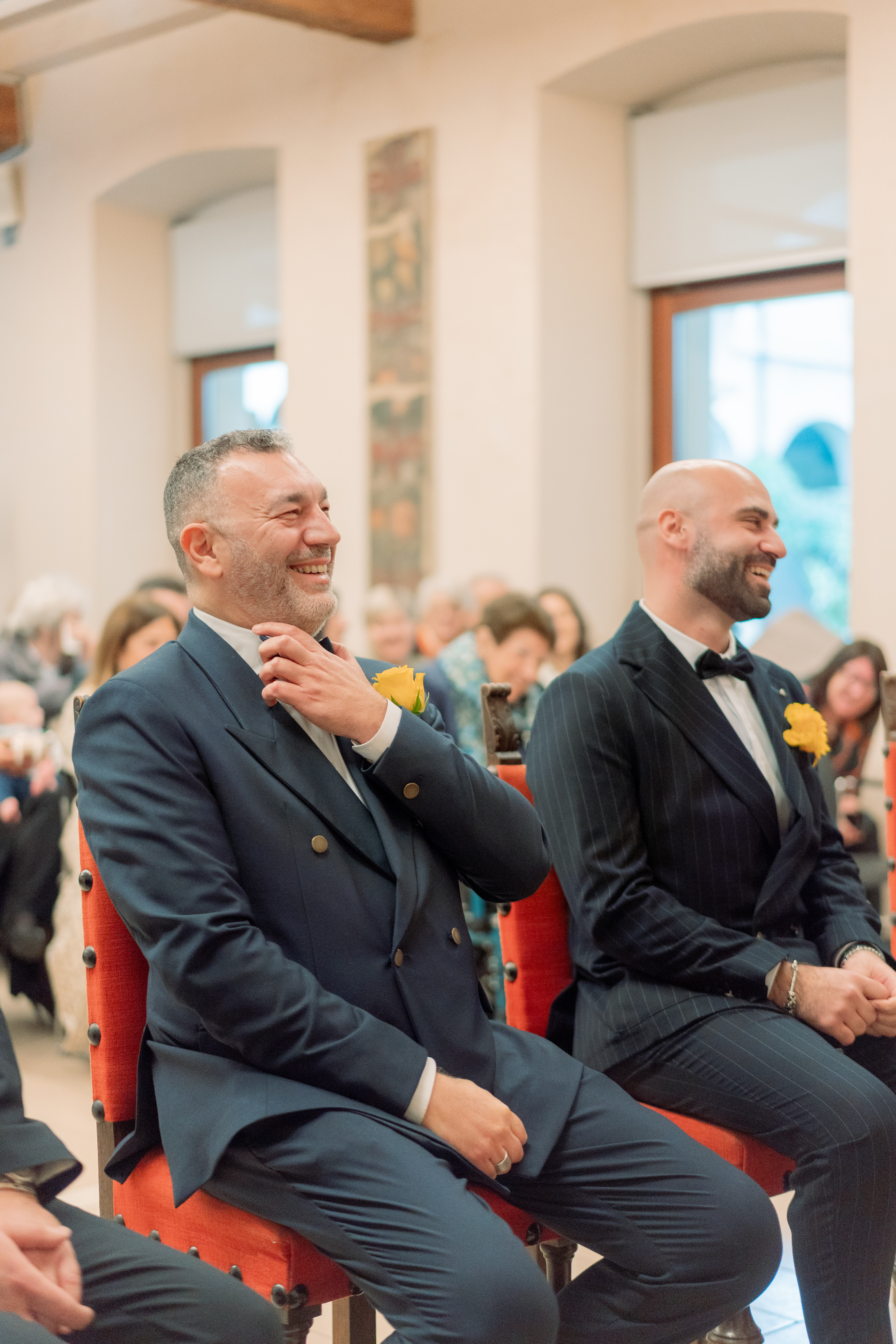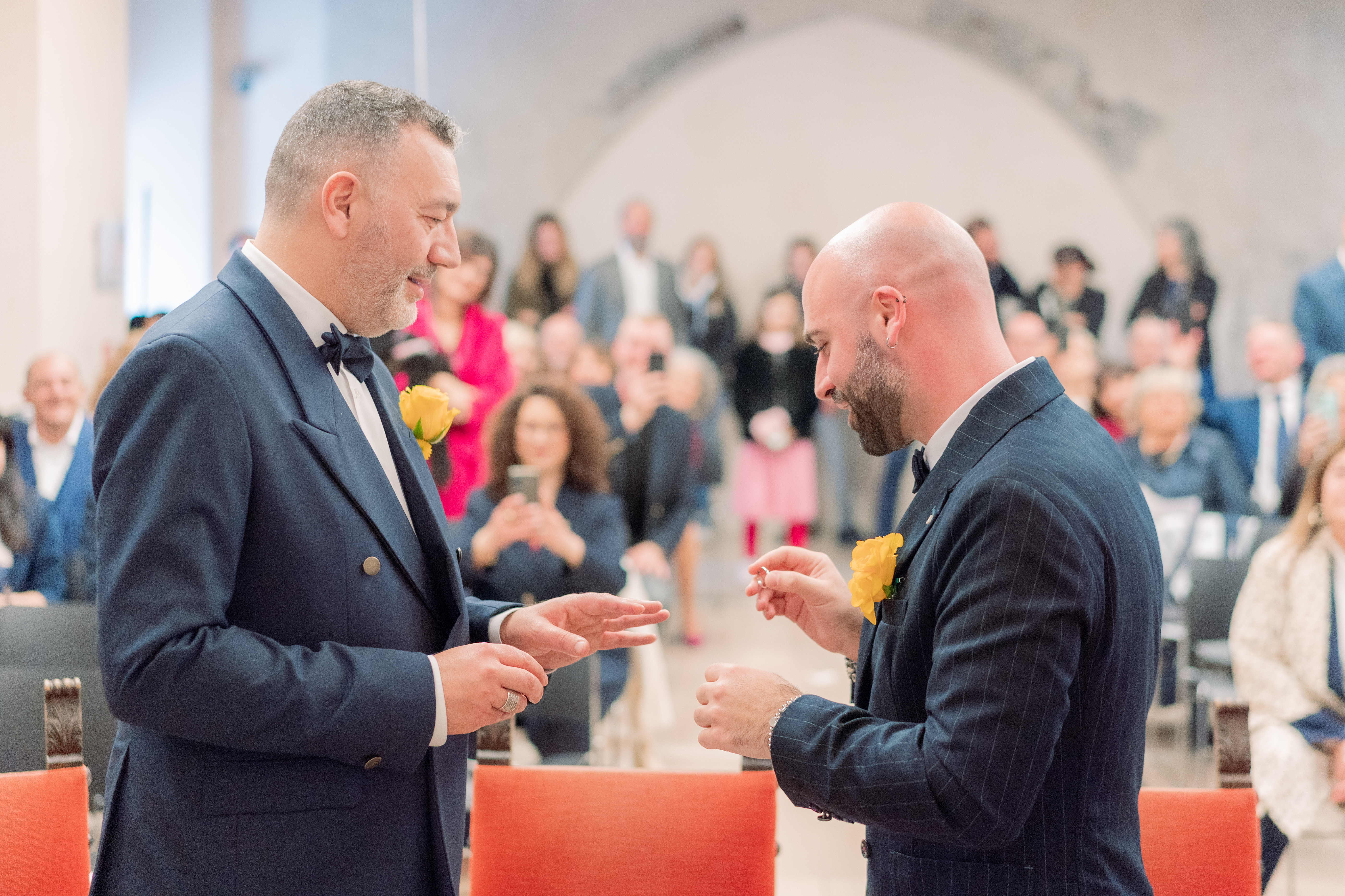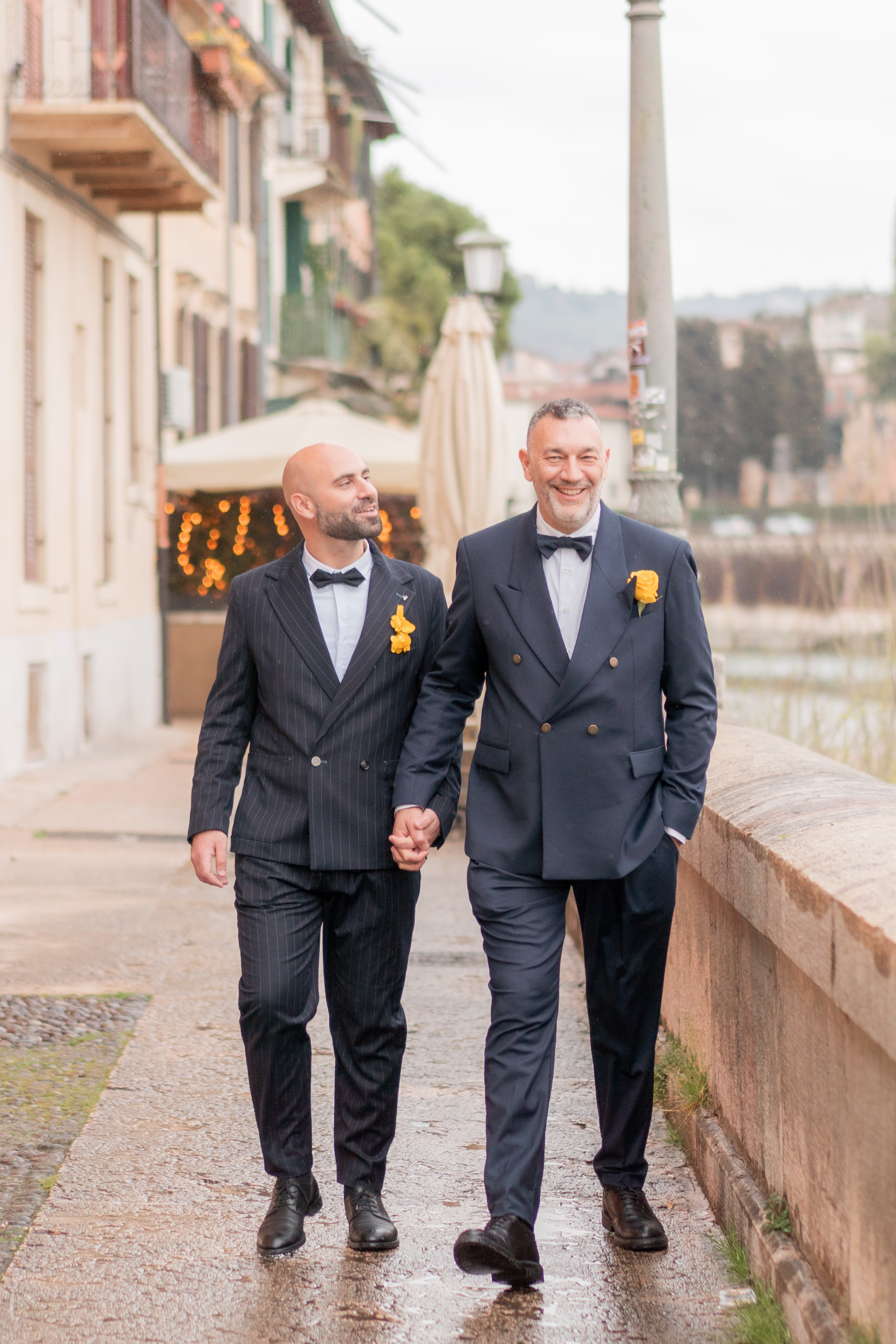 Il matrimonio civile alla Tomba di Giulietta. Il giorno del matrimonio si sono sposati civilmente alla Tomba di Giulietta, a Verona. Un luogo simbolico, carico di significato, che ha fatto da cornice a una cerimonia intensa e partecipata. C’era tanta gente. Gente vera, presente, affettuosa. L’ingresso della mamma di Alessandro è stato uno dei momenti più toccanti della giornata. Nonostante la malattia, era lì. Presente. Fiera. La famiglia di Valentino, invece, non ha partecipato. Una mancanza che si sentiva, ma che non ha tolto valore a ciò che stava accadendo. Durante lo scambio degli anelli e delle promesse, l’emozione era palpabile. Uno dei discorsi più belli che abbia mai ascoltato durante una cerimonia. Mentre fotografavo, mi si sono riempiti gli occhi di lacrime. Succede spesso ai matrimoni, ma quelle parole avevano un peso diverso. Erano dense di significato.