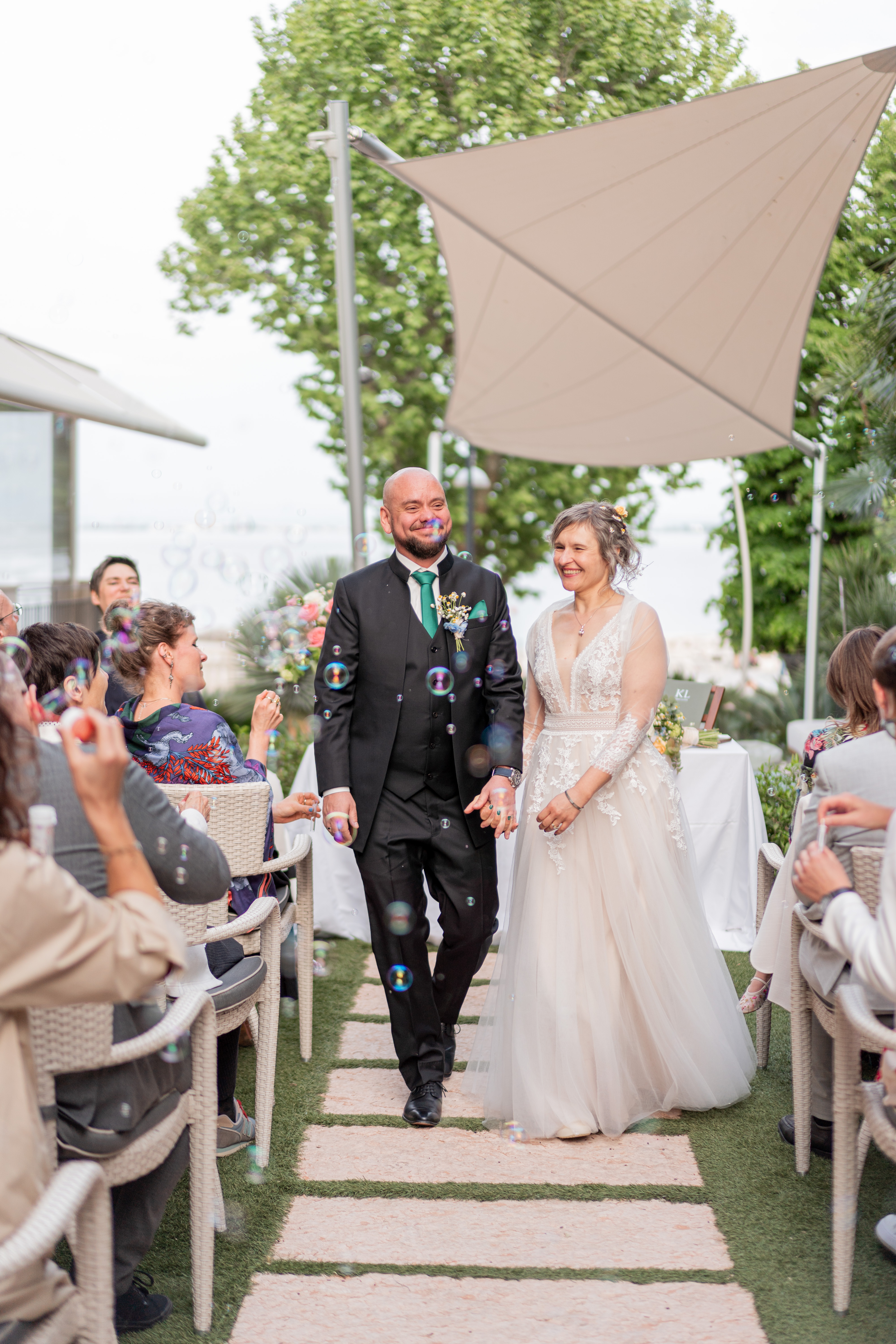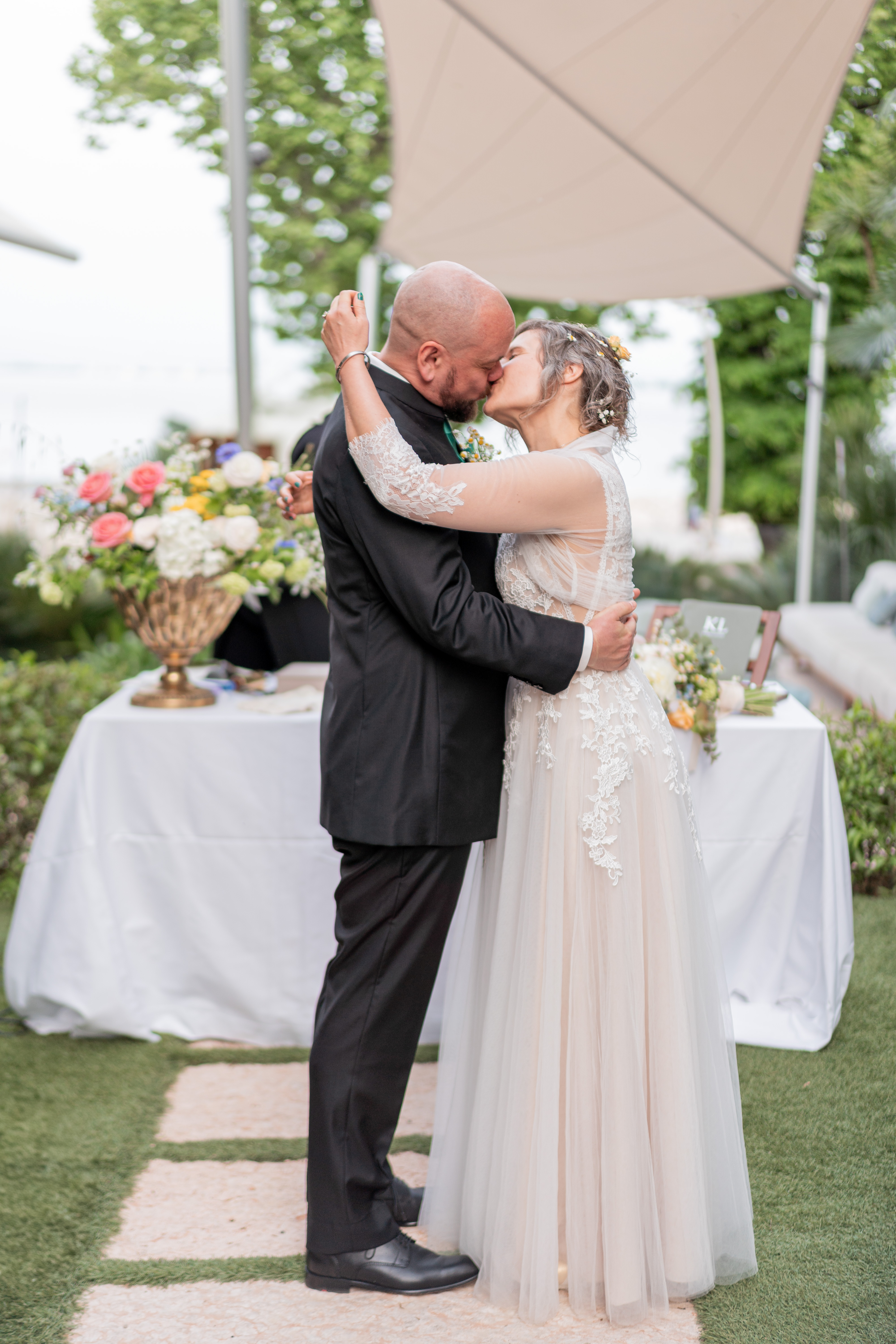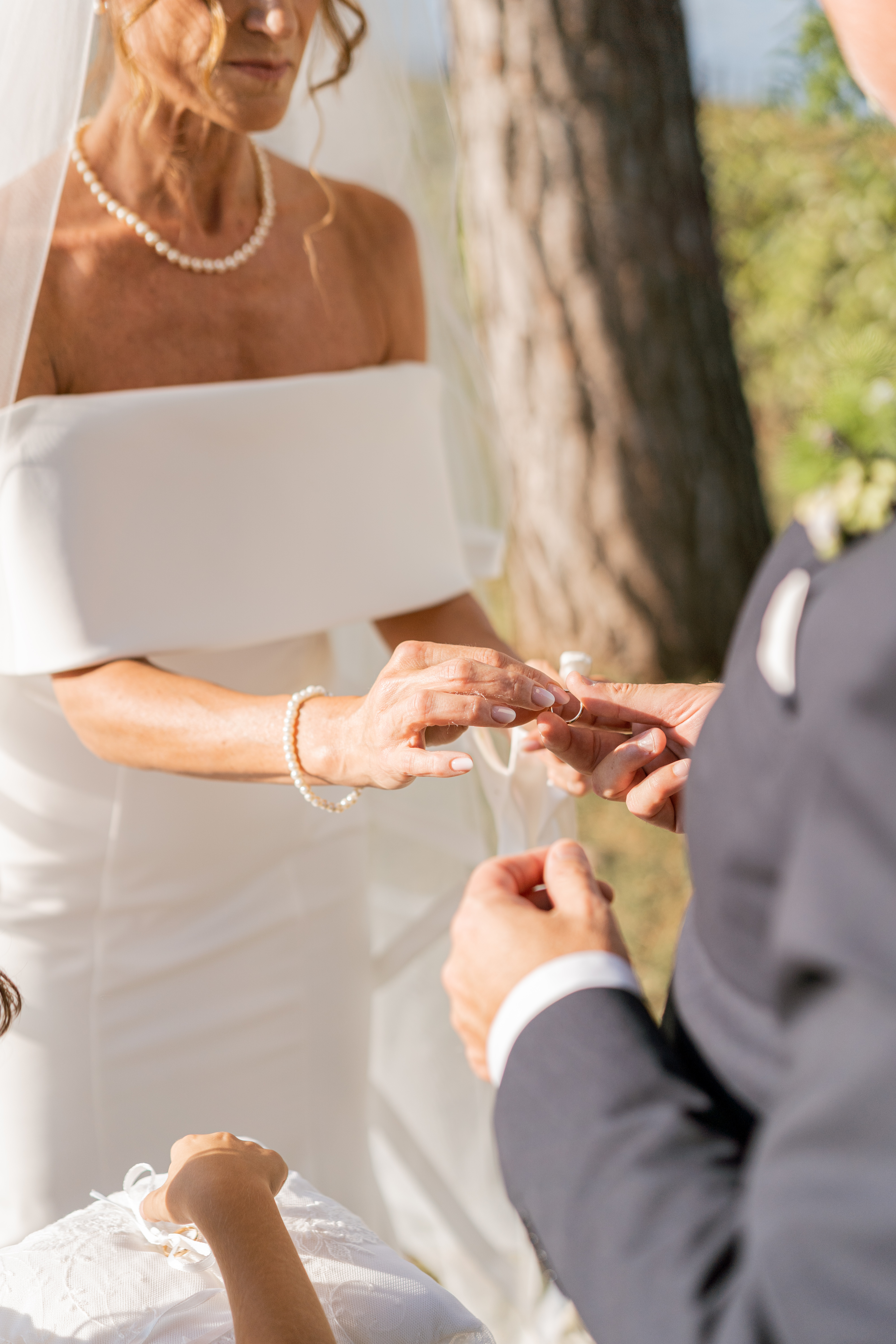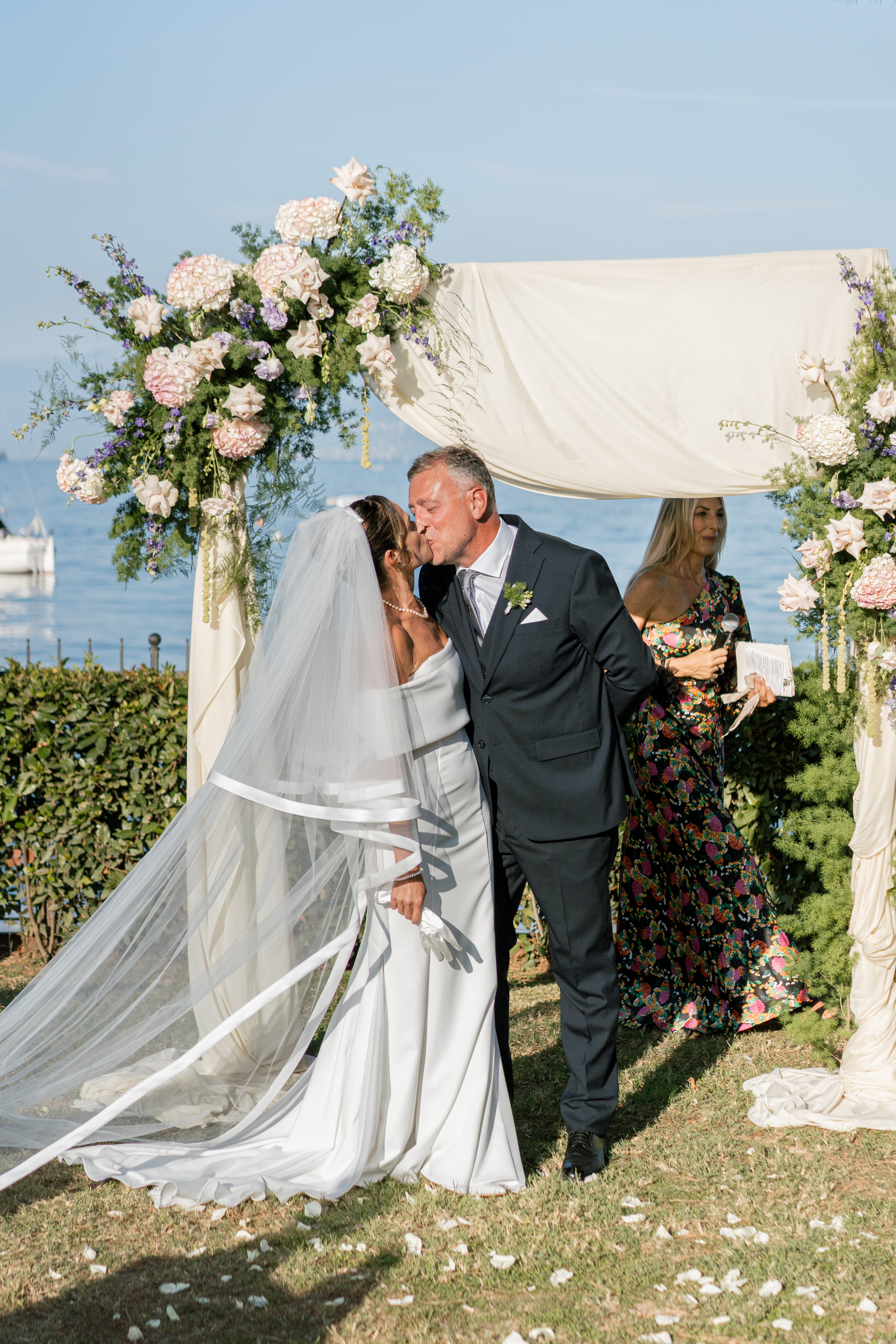 Le promesse allo Splendido Bay. Marci aspettava al luogo della cerimonia, ripetendo incredulo: “Ma non ci posso credere”. Il papà di Bianca l’ha accompagnata, le ha dato un bacio e, prendendola per mano, le ha sussurrato: “Andiamo”. Quando Marci l’ha vista arrivare, ha sorriso. E poi ha riso. Bianca era visibilmente emozionata. Durante la cerimonia, il silenzio era quasi ammirato. Gli sguardi, le lacrime delle madri, della sorella, l’attenzione totale mentre la celebrante leggeva il testo. Le promesse sono state il cuore della giornata. Prima Bianca, con la voce che cercava di non cedere all’emozione. Poi Marci, con parole improvvisate, autentiche, nate dalla sua spontaneità. Il primo bacio è arrivato tra sorrisi e lacrime. Subito dopo, una bambina ha portato gli anelli su un cuscinetto bianco con un fiocco rosato. Un gesto semplice, ma carico di significato.