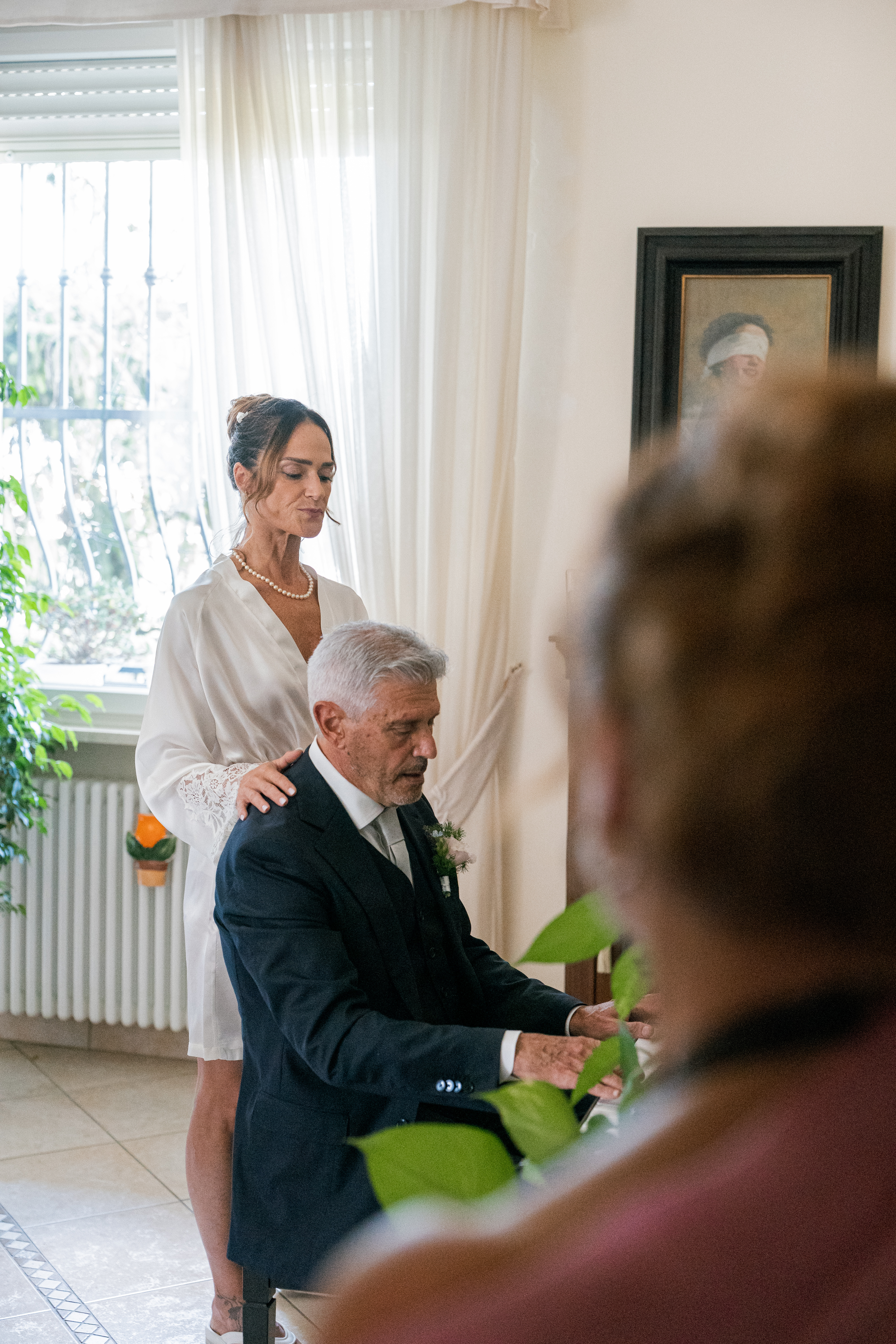 La vestizione di Bianca: entrare in un’intimità vera. Arrivare a casa del papà di Bianca è stato come entrare in uno spazio carico di memoria. Una casa vissuta, con un’anima forte: un pianoforte in legno di quercia in un angolo, tazzine di porcellana che riportavano alla mente i caffè lenti di una volta, quelli condivisi con le persone care. Quando entri nella casa di qualcuno, entri nella sua intimità. E quel giorno io ero dentro la loro storia. Bianca era seduta, calma, mentre ultimava i preparativi. Indossava un abito semplice in velluto bianco: essenziale, elegante, perfettamente in linea con il suo modo di essere.