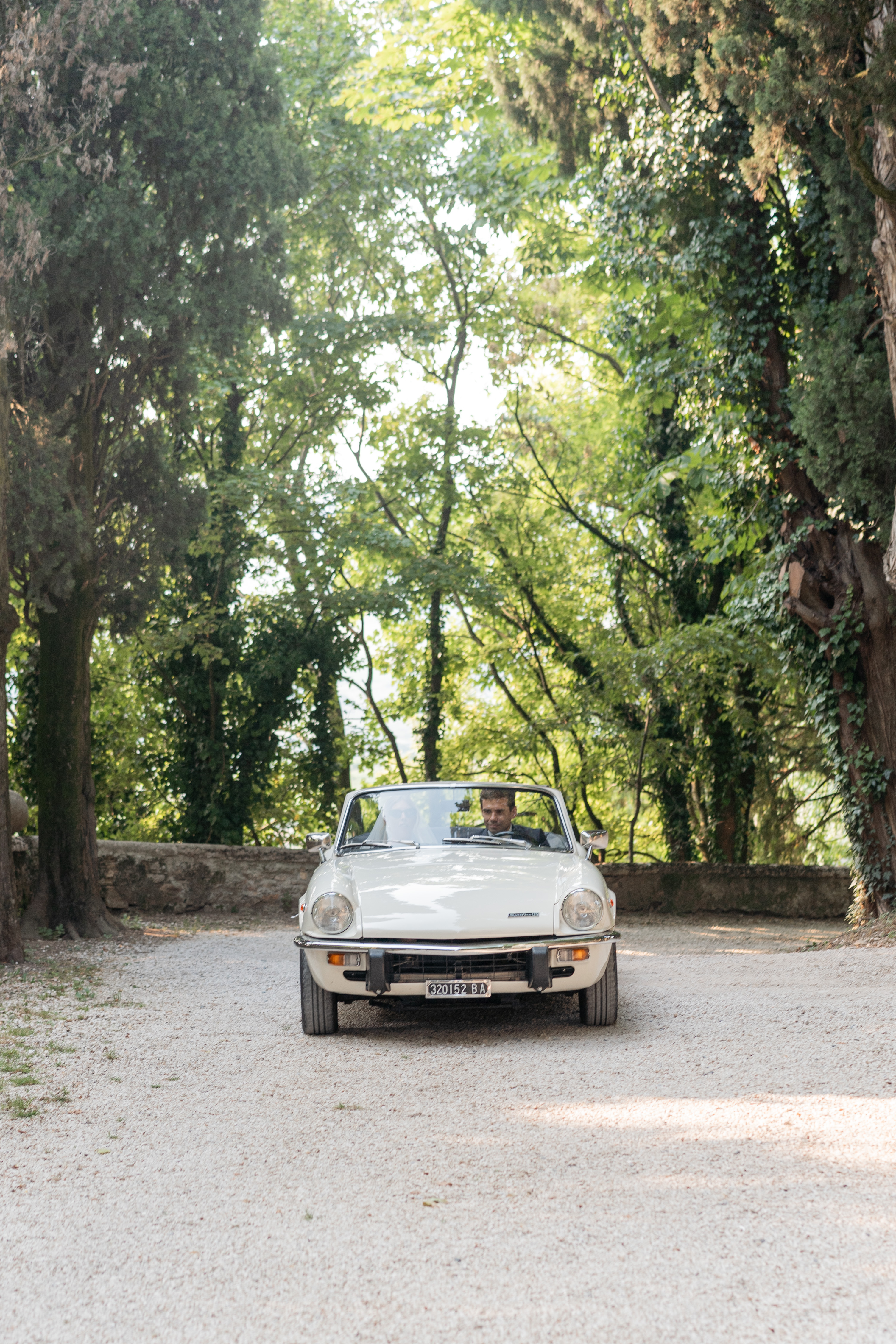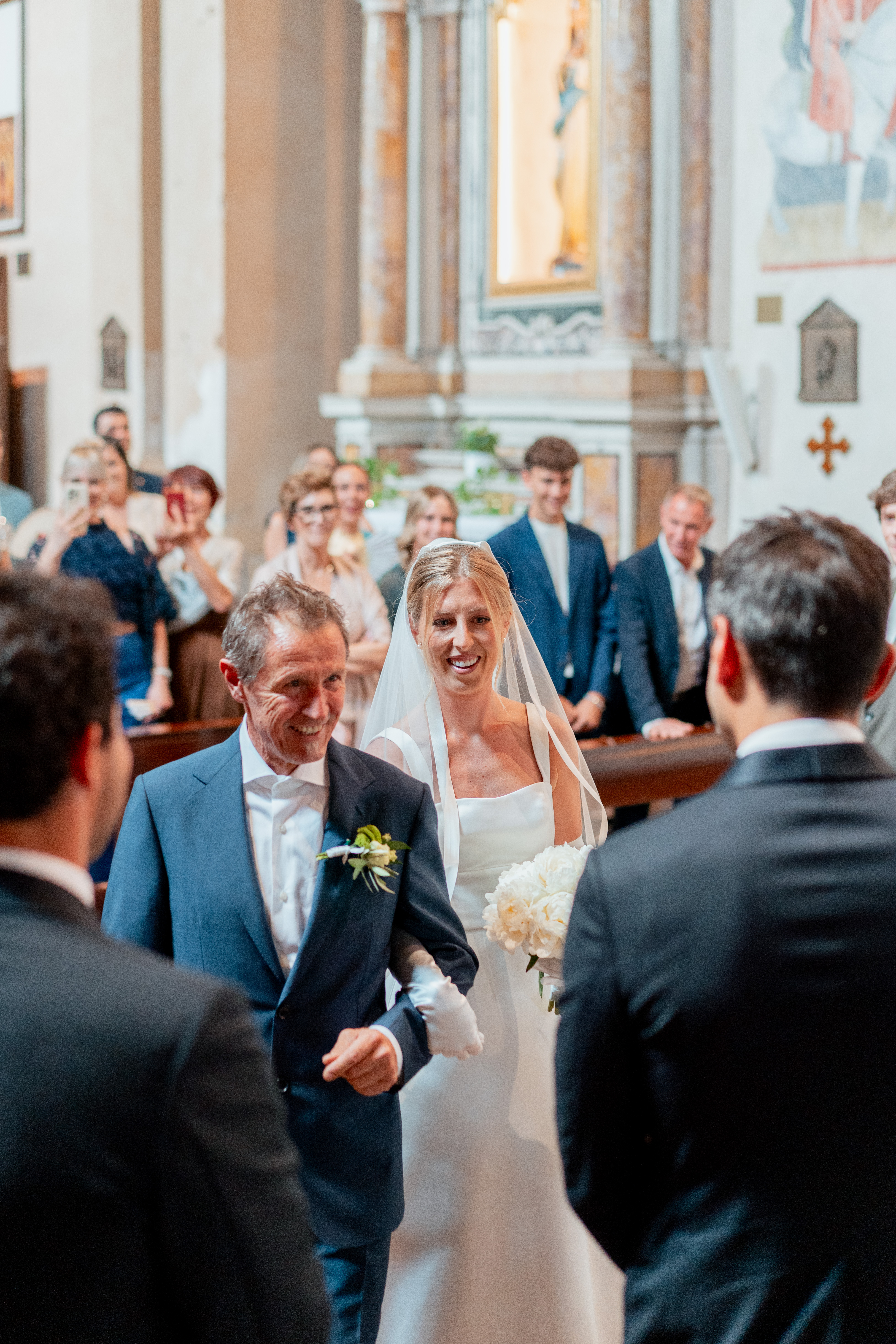 I dettagli prima della cerimonia. Mentre gli invitati prendevano posto e osservavano la bellezza della chiesa, mi sono spostato all’interno per fotografare i dettagli: i fiori, l’altare, le partecipazioni, l’atmosfera che lentamente si costruiva. Per un piccolo incidente stradale, la sposa e il videomaker sono arrivati con qualche minuto di ritardo. Lo sposo è arrivato quasi nello stesso momento. Abbiamo atteso, poi ci siamo posizionati lungo la navata. Quando la sposa è arrivata, accompagnata dal papà, lo ha fatto a bordo di una macchina vintage color beige latte. Un ingresso elegante, coerente con il suo abito: lungo, bianco, romantico. Mi è piaciuto subito.