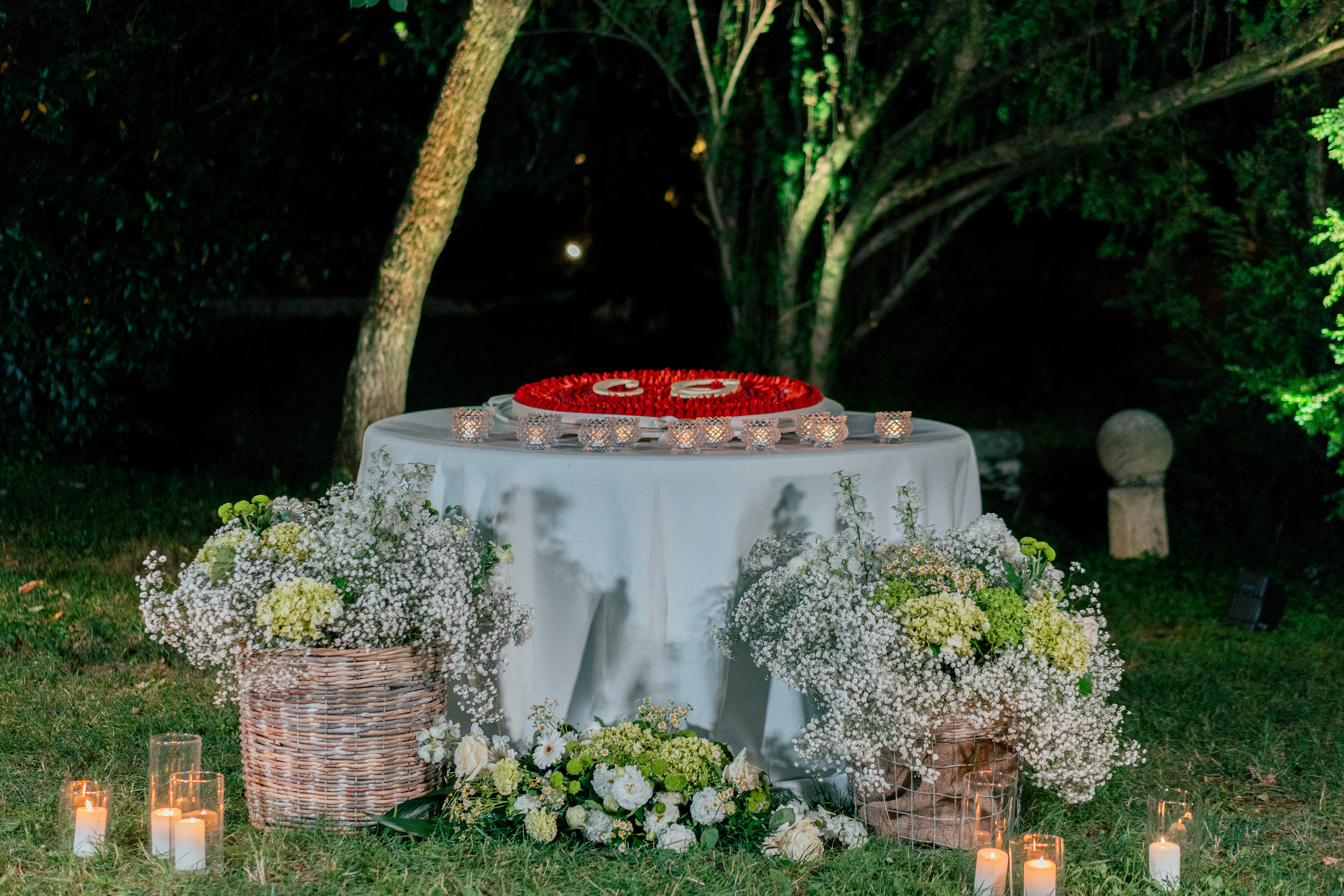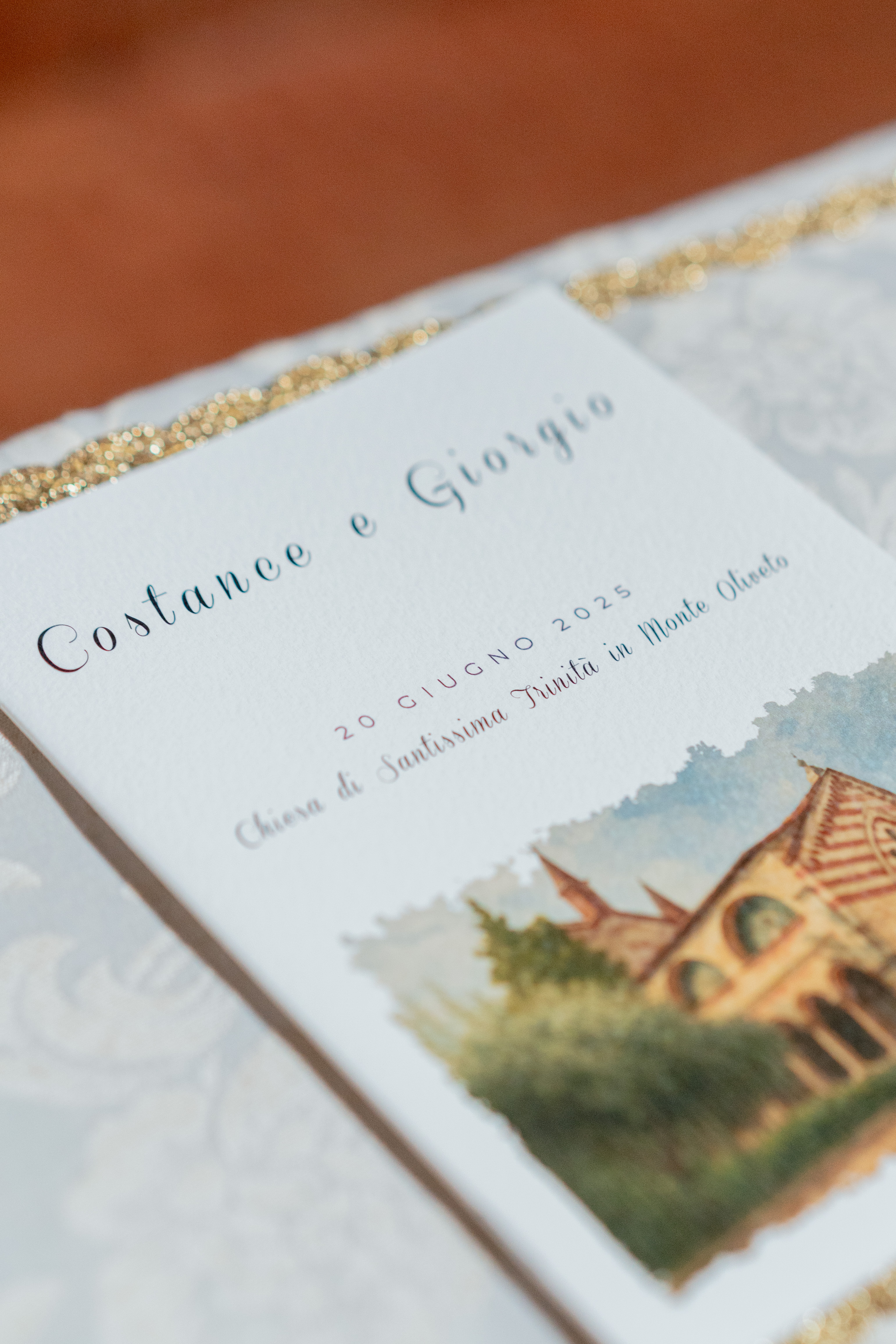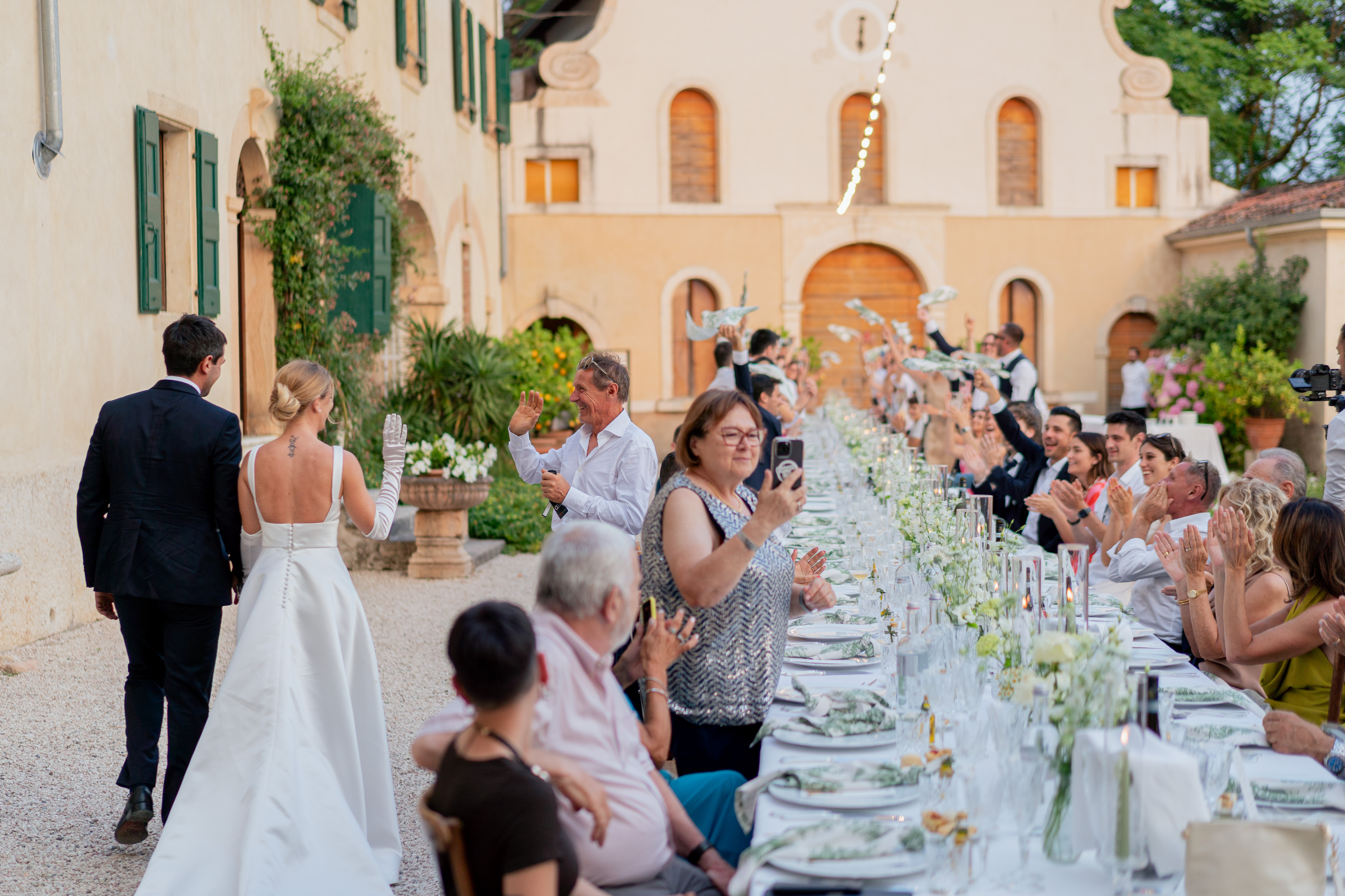 Il ricevimento a Villa Pellegrini, tra le colline della Valpolicella. Dopo la cerimonia ci siamo diretti a Villa Pellegrini, immersa nelle colline di Grezzana, nel cuore della Valpolicella. Ad accoglierci c’era un allestimento curato in ogni dettaglio: un grande tavolo imperiale, una palette verde elegante, decorazioni floreali importanti realizzate dalle fioriste Felix, e l’organizzazione impeccabile della wedding planner Cristiana. Un dettaglio che mi ha colpito particolarmente: il labrador disegnato sul menu. Un richiamo delicato e personale alla loro storia.