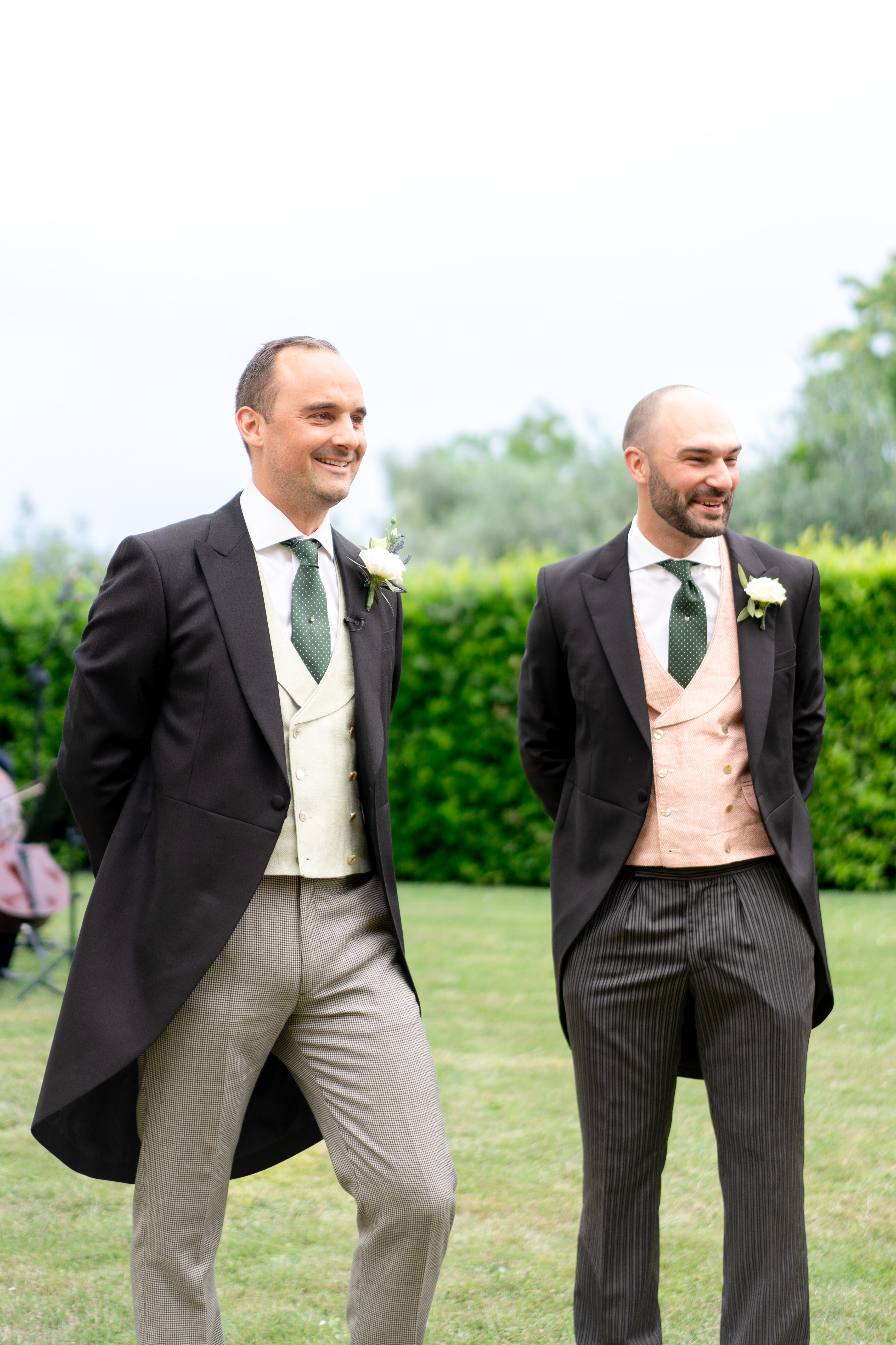 I preparativi: stile, carattere, identità I preparativi hanno confermato subito una cosa: questo matrimonio aveva una personalità fortissima. Hamish indossava un abito ispirato ai primi del Novecento, elegante e fuori dal tempo. Claire era semplicemente straordinaria: un abito lungo, avvolgente, con spalline in pizzo che univano raffinatezza e delicatezza. Tutto era curato, ma mai rigido. Ogni dettaglio parlava di loro.