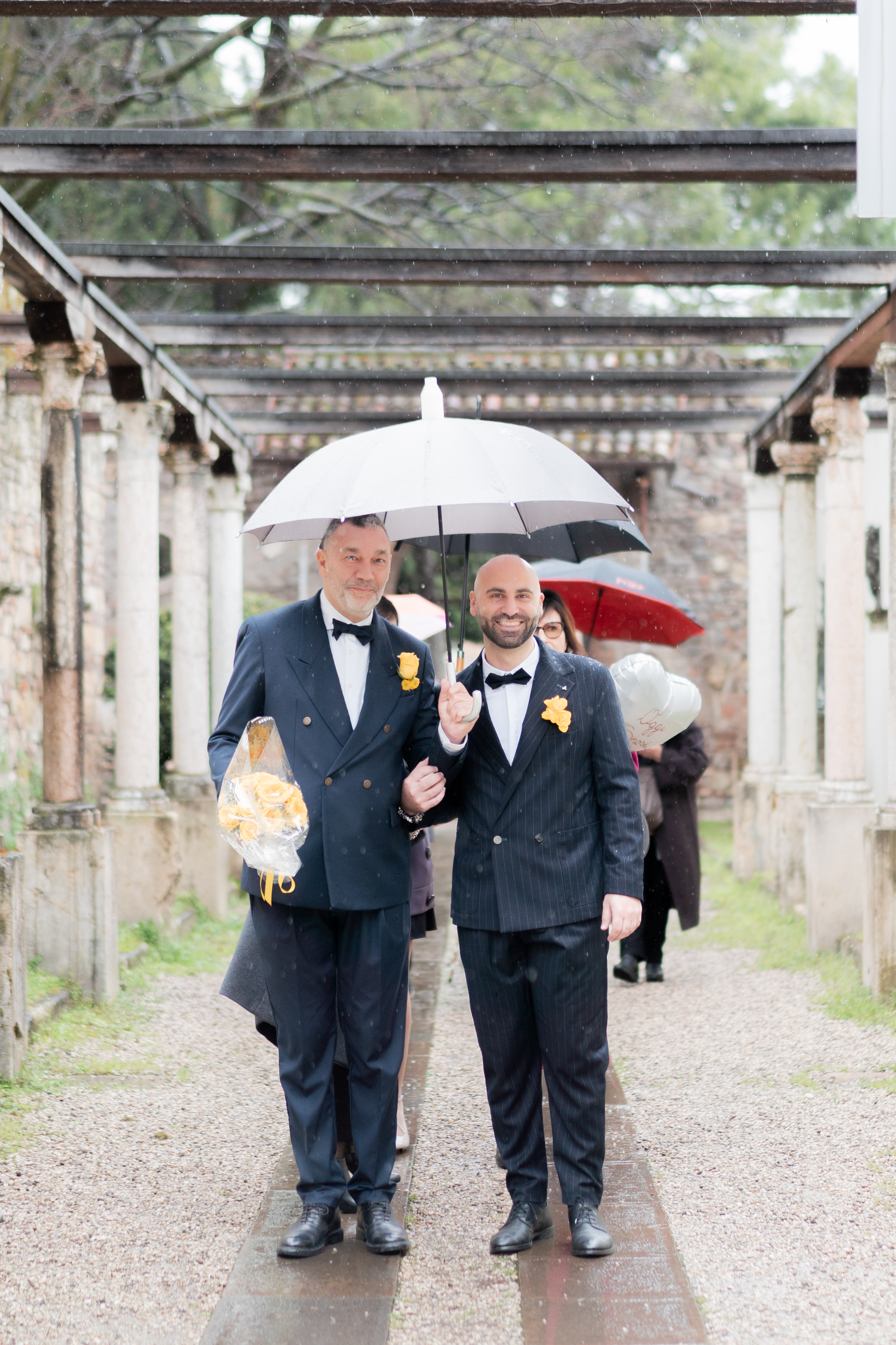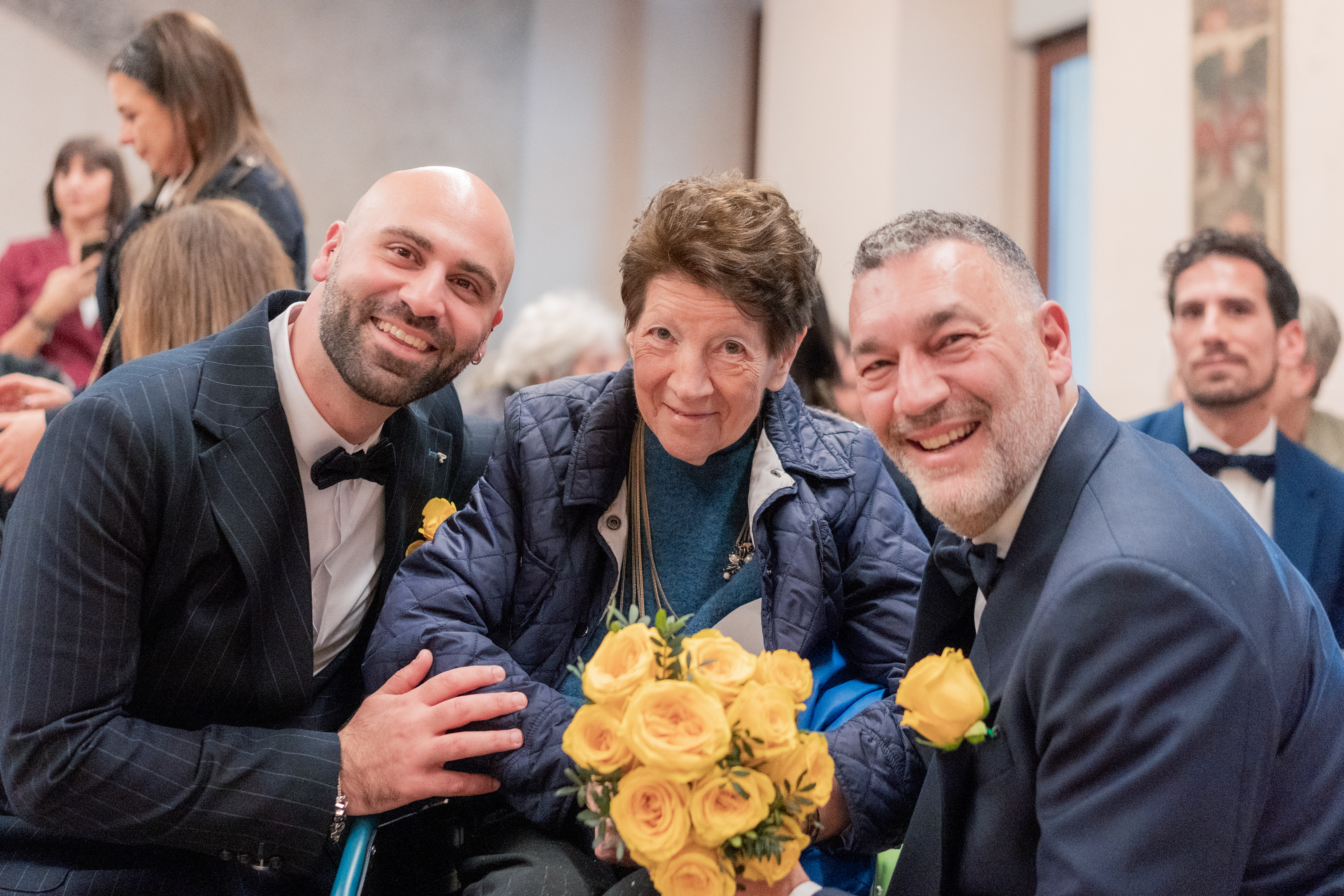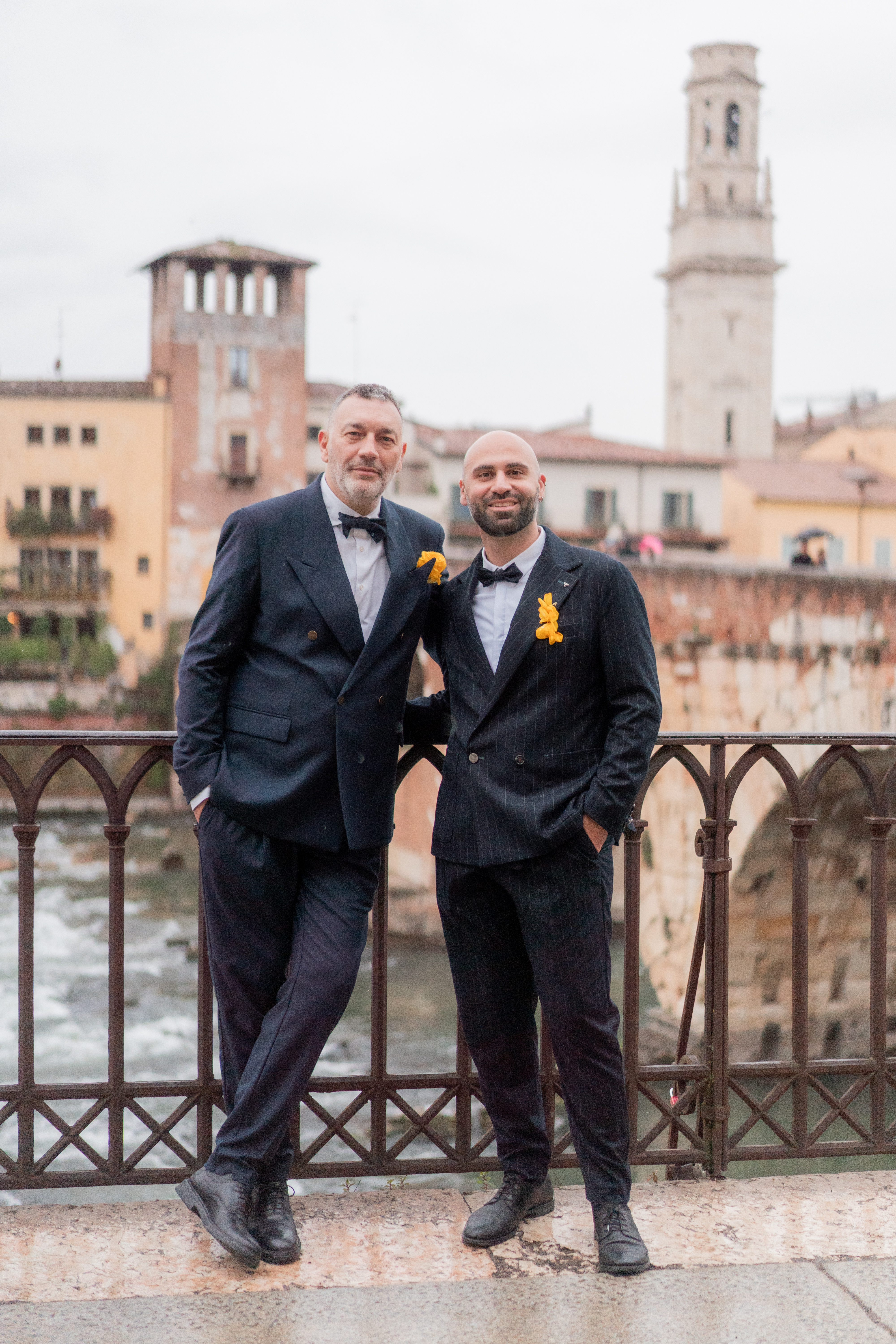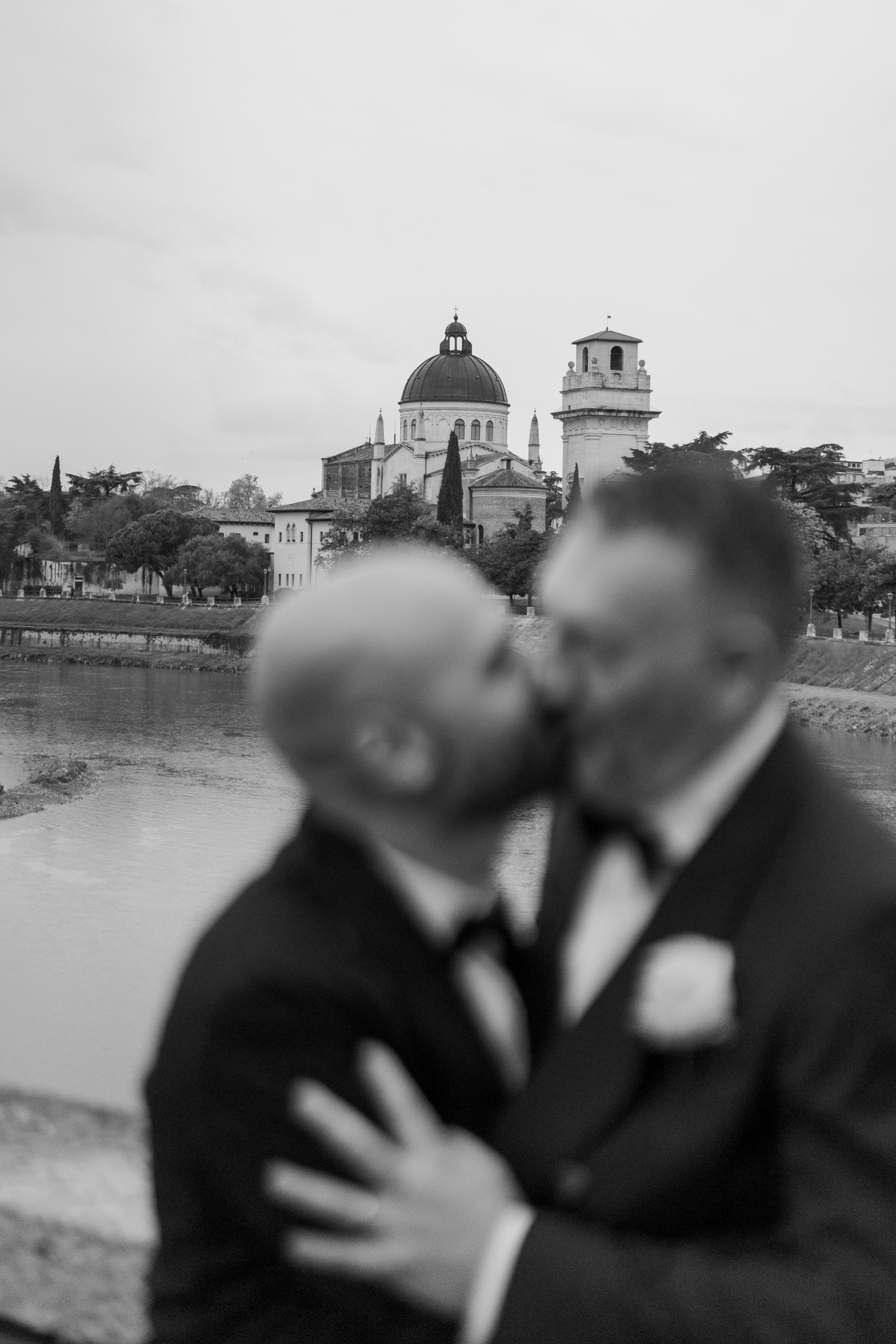 Il matrimonio civile alla Tomba di Giulietta. Il giorno del matrimonio si sono sposati civilmente alla Tomba di Giulietta, a Verona. Un luogo simbolico, carico di significato, che ha fatto da cornice a una cerimonia intensa e partecipata. C’era tanta gente. Gente vera, presente, affettuosa. L’ingresso della mamma di Alessandro è stato uno dei momenti più toccanti della giornata. Nonostante la malattia, era lì. Presente. Fiera. La famiglia di Valentino, invece, non ha partecipato. Una mancanza che si sentiva, ma che non ha tolto valore a ciò che stava accadendo. Durante lo scambio degli anelli e delle promesse, l’emozione era palpabile. Uno dei discorsi più belli che abbia mai ascoltato durante una cerimonia. Mentre fotografavo, mi si sono riempiti gli occhi di lacrime. Succede spesso ai matrimoni, ma quelle parole avevano un peso diverso. Erano dense di significato.